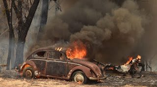 (Jak to, že tato auta v při požáru v Kalifornii shořela, zatímco kolemstojící stromy jsou nedotčeny?)
